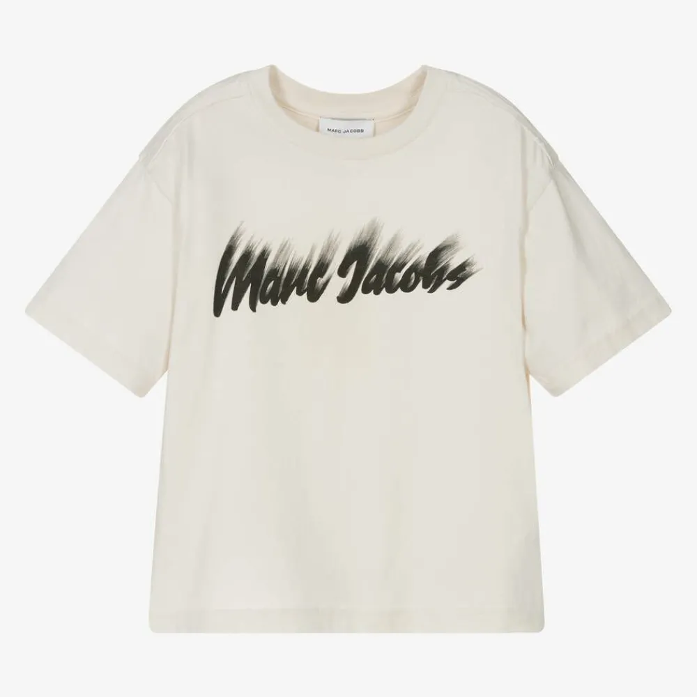 Light beige T-shirt for boys and girls by MARC JACOBS, made in soft organic cotton jersey. Casual and comfortable, this cool top has raw edges on the seams and a black smudged logo on the front for a statement designer finish.