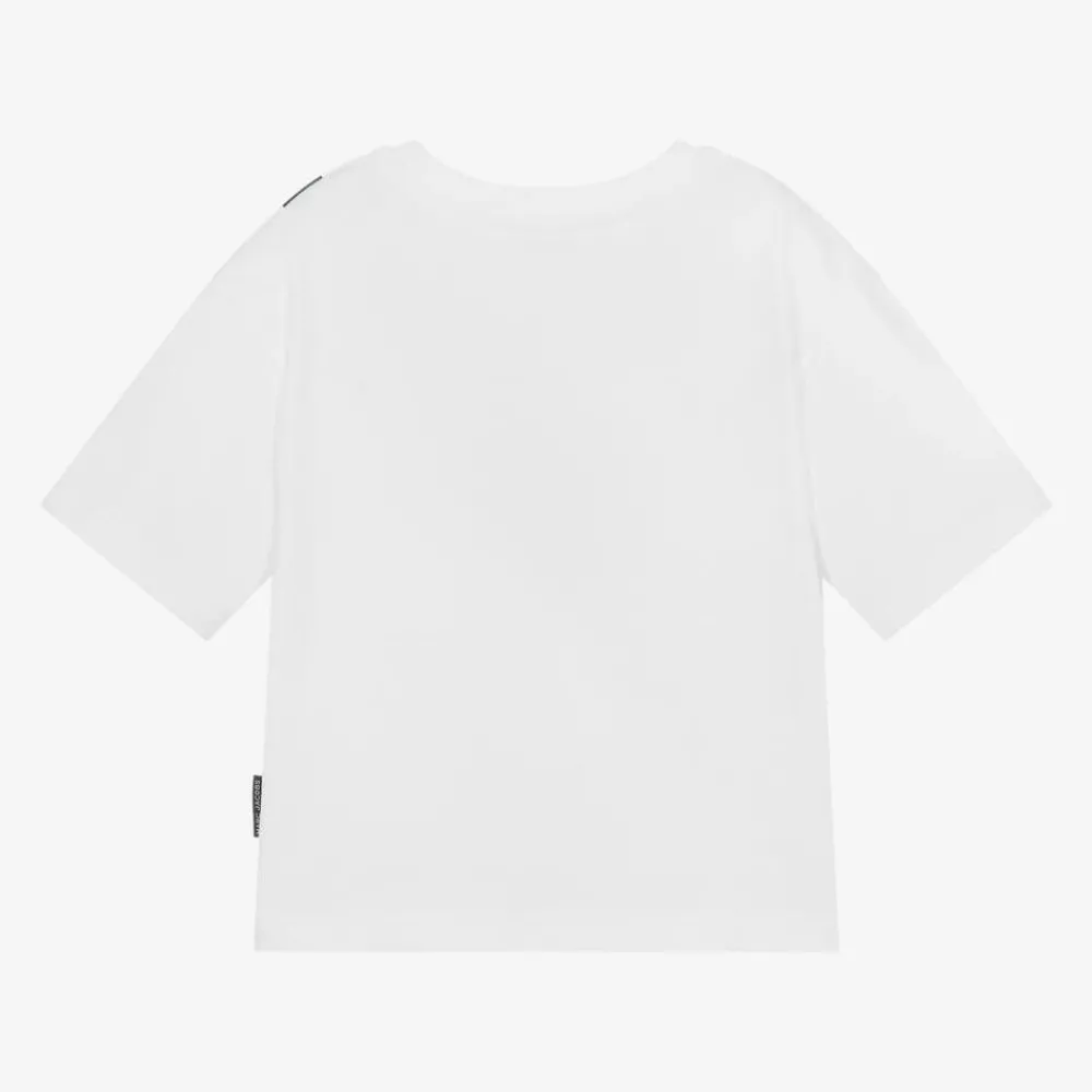 Casual white cotton T-shirt for boys and girls by American brand MARC JACOBS, printed with the designer's black Biker belt bag across the front. Made in soft, comfortable jersey, it is boxy in style, with short sleeves, dropped shoulders and a logo tab on one side seam.