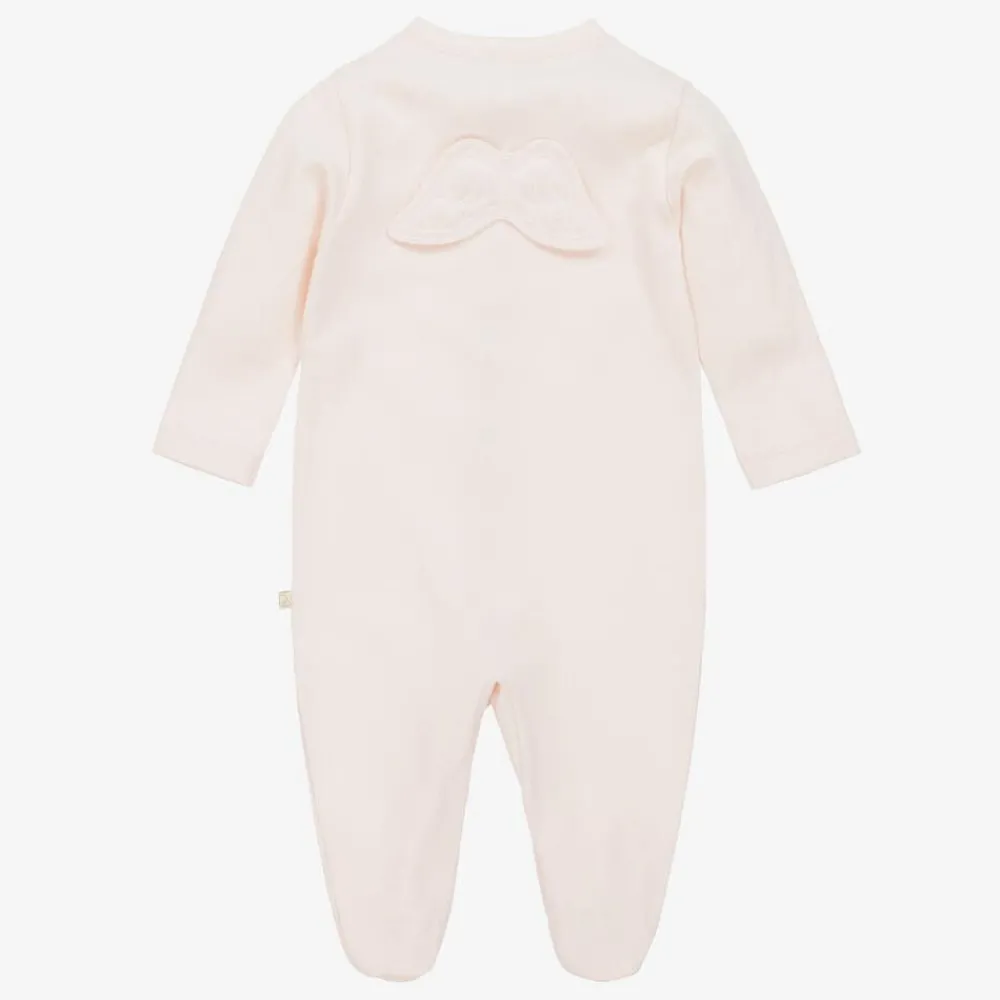Lovely pink super soft Pima cotton babygrow and shawl gift set for baby girls, designed by the Greek princess Marie-Chantal. The babygrow is made in comfortable pointelle jersey, with the brand's signature Angel Wings on the back, padded and embroidered. It fastens with easy-to-use poppers on the front and between the legs. It comes with a beautifully soft, knitted cotton and cashmere blend shawl, that has a corner hood patterned with a white intarsia crown.