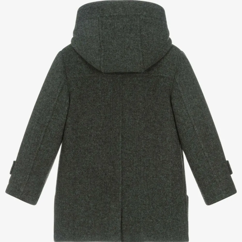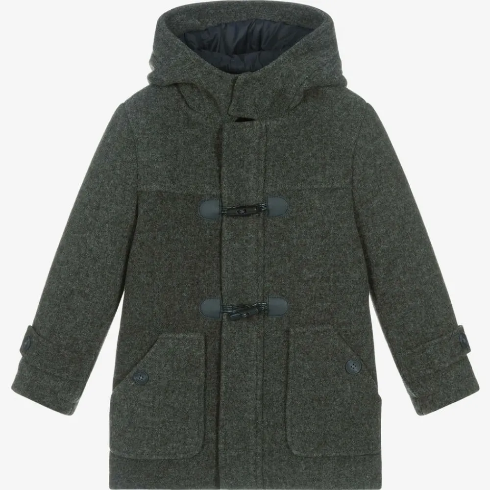 Dark grey hooded duffle coat for boys by Mayoral, with a traditional brushed feel. It has a secure zip fastening on the front, as well as classic navy blue toggles and navy blue logo embossed buttons on the patch pockets and sleeves. This smart, timeless style is lined in silky, quilted fabric for comfort during wear.