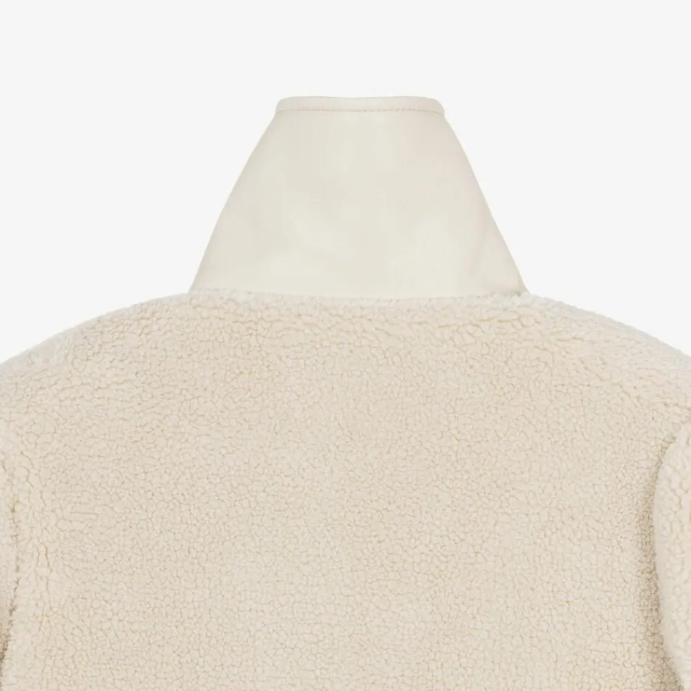 Lovely pale beige coat for older girls by Mayoral, made in super soft teddy fleece. Warm and cosy, this casual coat has beige faux leather trims on the cuffs, front pockets and on the underside of the collar for an elevated look. There are matching trims on the inside edges of the coat. This stylish piece is fully lined for comfort and fastens on the front with a gold metal zip.