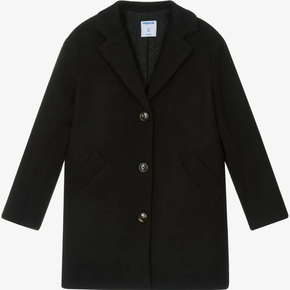 Lovely black felted coat for older girls by Mayoral, with a soft wool feel. Faux tortoiseshell buttons fasten the front in a timeless style. It has a quilted lining for comfort, a vent on the back for ease of movement, and pointed lapels for a smart finish.