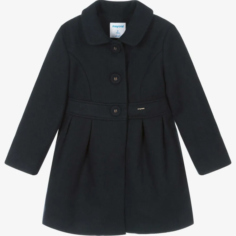 A traditional-style navy blue coat for girls by Spanish brand Mayoral, made in a soft felted fabric. Easy to wear, this coat has a classic collar, button fastenings, and pockets on the front. It has a gold metal logo on the waist, with a pleated skirt and a silky smooth lining for comfort.