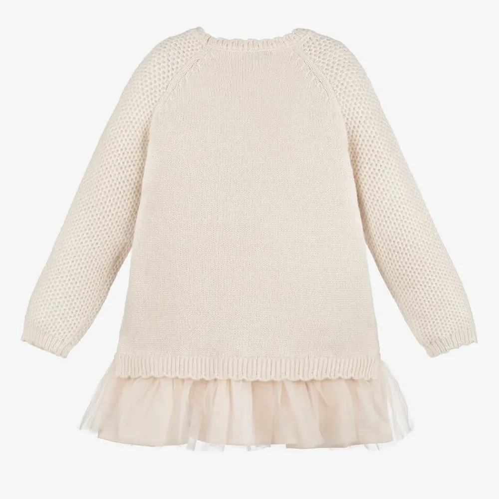 Ivory dress for girls by Mayoral, made in a soft knit with added silver threads for a touch of sparkle. The long-sleeves have a honeycomb pattern and there are sweet scalloped, ribbed trims. Made in layers of soft tulle, the dropped hem has a cotton jersey lining with a pale pink hue and for a pretty finish, there is an embroidered floral design on the front. This item contains recycled fibres.