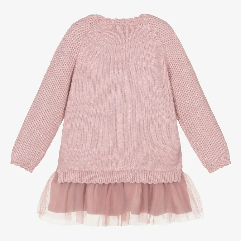 Pink dress for girls by Mayoral, made in a soft knit with added silver threads for a touch of sparkle. The long-sleeves have a honeycomb pattern and there are sweet scalloped, ribbed trims. Made in layers of soft tulle, the dropped hem has a cotton jersey lining and for a pretty finish, there is an embroidered floral design on the front. This item contains recycled fibres.