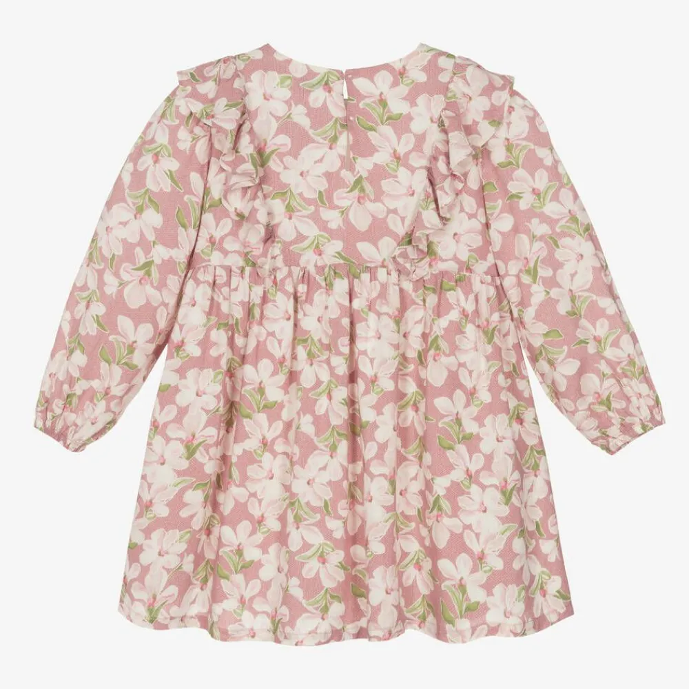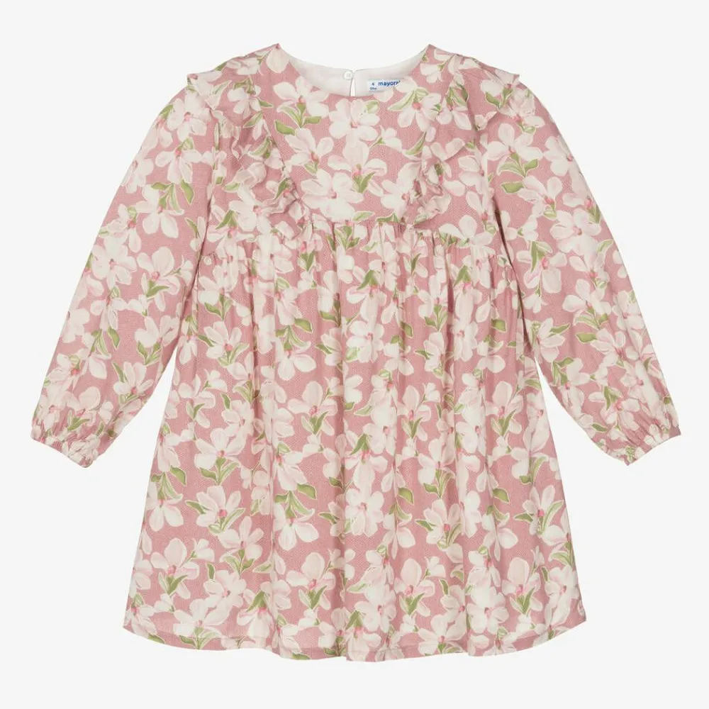 Lovely pink dress for girls by Mayoral, made in soft, lightweight viscose. Patterned with a pretty pink, white and green floral print, it has silver threads running through for a touch of sparkle. Fully lined for comfort, it has long sleeves with elasticated cuffs and sweet ruffles on the front and back of the bodice. It fastens neatly on the back with concealed buttons.