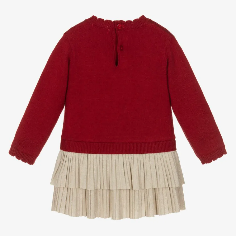 A charming red long-sleeved dress for little girls by Mayoral. Designed to look like separates, the softly knitted jumper-style bodice is stitched with an adorable reindeer design on the chest, with floral embroidery on its antlers and beige tassel trims. Fastening neatly with buttons on the back, there is cable knit detailing on the sides and scalloped edging on the round neckline. The beige dropped-waist layered pleated skirt is made from lightweight stretchy jersey with raw edges and is woven with gold metallic threads for a touch of sparkle.