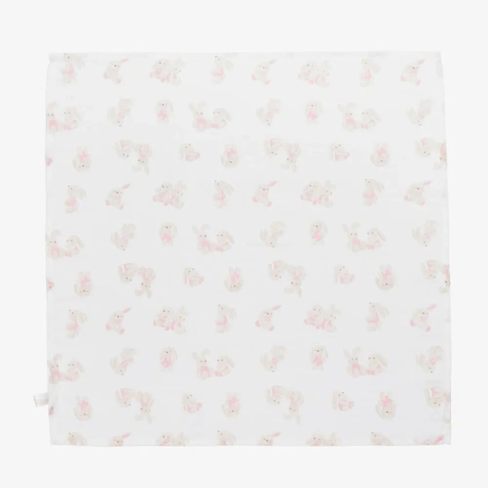 A pack of three white and pink muslin cloths for baby girls by Mayoral, made in super soft, lightweight cotton. One has an adorable bunny print in beige and pink, whilst the other two have a spotted pattern. These useful, absorbent cloths are great for cleaning up little spills or can be used as a burping cloth or as a nursing cover.