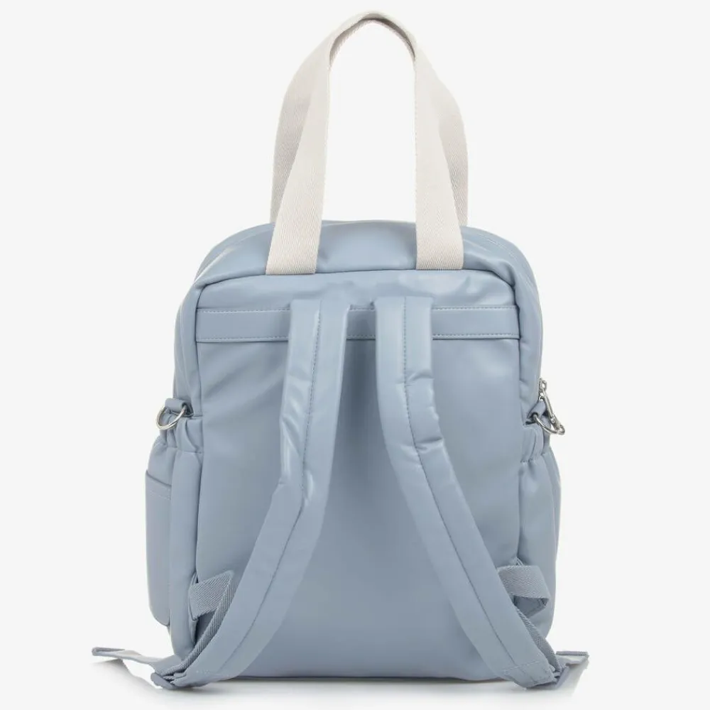 A dusky blue changing backpack by Mayoral, made in faux leather and lined in silky logo-patterned twill. Cleverly designed to store baby's essentials, it has a velcro-closing side pocket suitable for wipes or tissues, an inner foil-lined, insulated bottle holder, and multiple pockets. This practical bag has a two-way zip fastening and a front pocket with a drawcord detail. The bag includes a silky, padded changing mat. The branded carry handles and clip-on buggy straps are made in durable canvas, while the adjustable shoulder straps are padded for comfort.