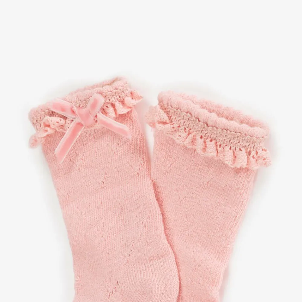 Pretty pink socks for baby girls by Spanish brand Mayoral, with lace trims and little velvet bows on the cuffs. Made in a soft, cotton blend, they have a decorative 'V' shaped pattern in the knit.