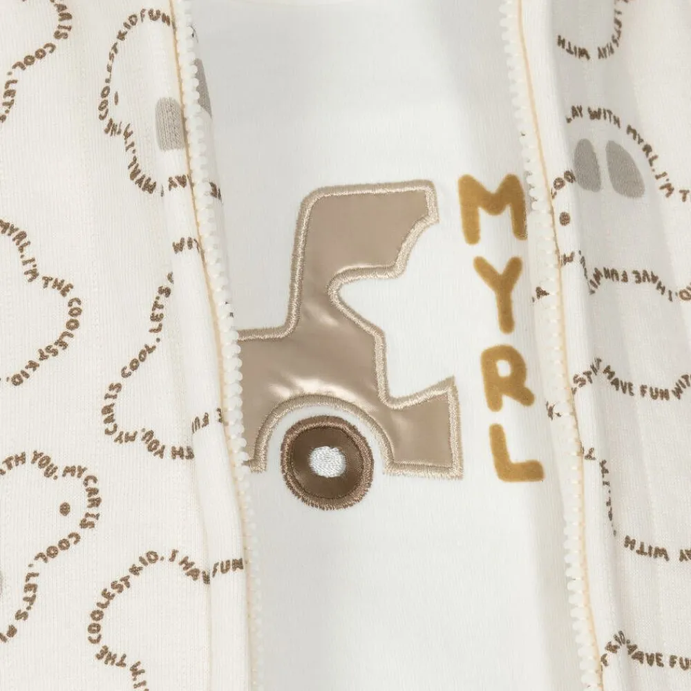 Designed for car fans in the making, this ivory and beige tracksuit for baby boys by Mayoral is made in comfortable and soft cotton jersey. The ivory long-sleeved tee has an embroidered bronze appliqué, a flocked logo and poppers on one shoulder. The zip-up top is made in a quilted effect jersey with a cute all-over print, ribbed trims and a cosy hood. A simple, pull-on style, the dark beige joggers have a little pocket on the back and cuffed ankles.