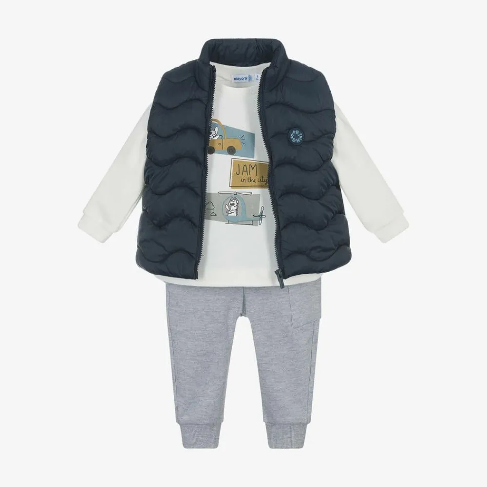 A casual and comfortable trouser set for little boys by Mayoral. The ivory sweatshirt and the grey marl joggers are made in a soft cotton-blend jersey, with a cosy fleecy inside. The sweatshirt has a fun 'Jam in the City' motif on the front, with popper fastenings on one shoulder. The trousers have an elasticated drawstring waist and durable reinforced knees. Providing an extra layer of warmth, the set is completed with a silky smooth, navy blue puffer gilet.