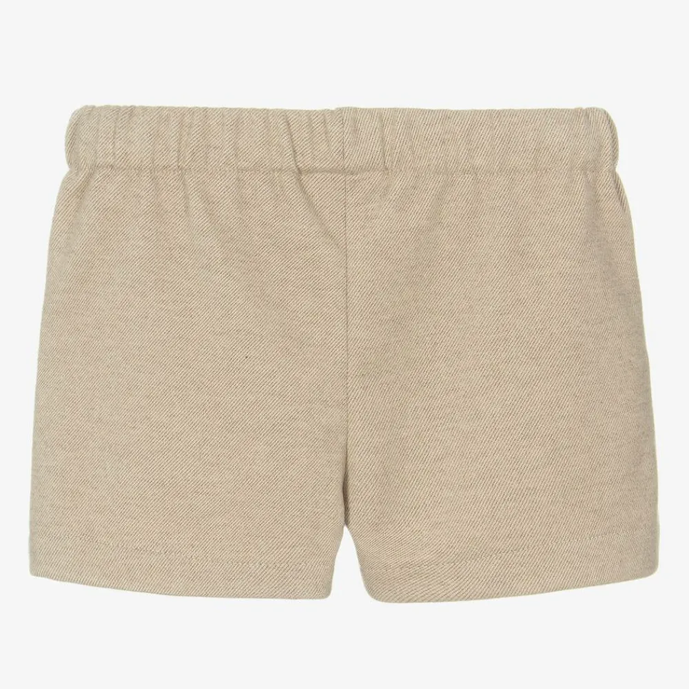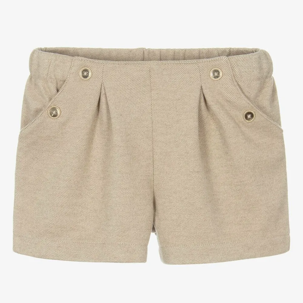 Smart beige shorts for little girls by Mayoral, made in beautifully soft fabric. Combining style with comfort, these lightweight shorts have an elasticated waistband and pleat detailing on the front. Gold, circular buttons add a decorative touch.