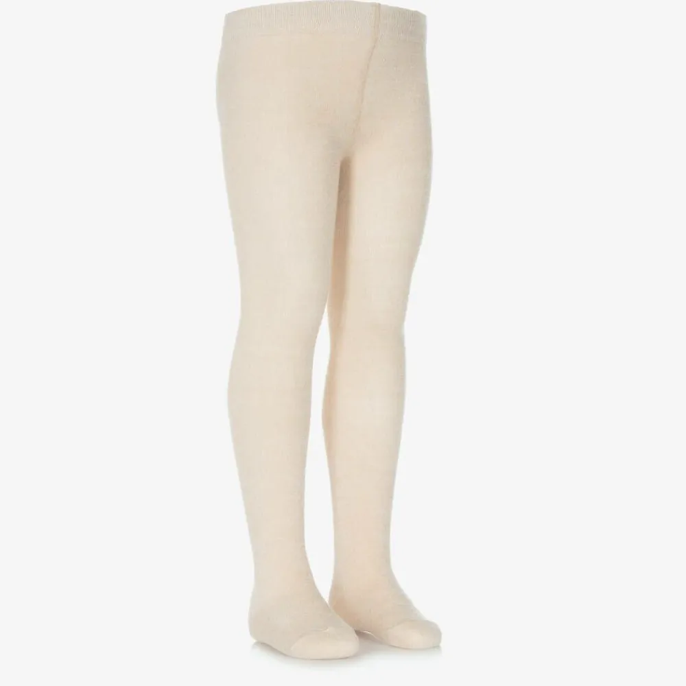 Beige tights for girls by Spanish brand Mayoral, glittering with gold thread. Made in a soft cotton blend, they have a comfortable, elasticated waistband.
