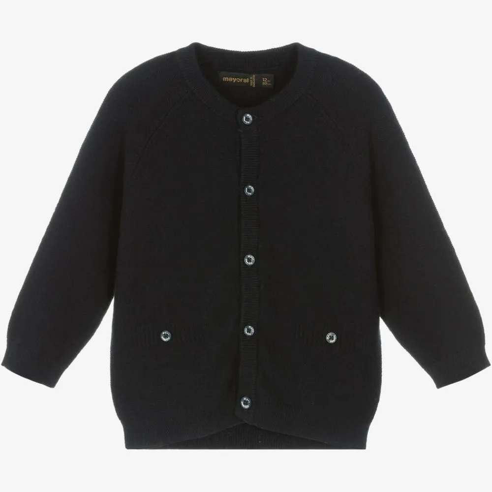 Cosy navy blue cardigan for little boys by Mayoral, knitted in a soft cotton and wool blend. It has a round neckline and fastens with buttons down the front. There is subtle faux pocket detailing, trimmed with matching buttons.