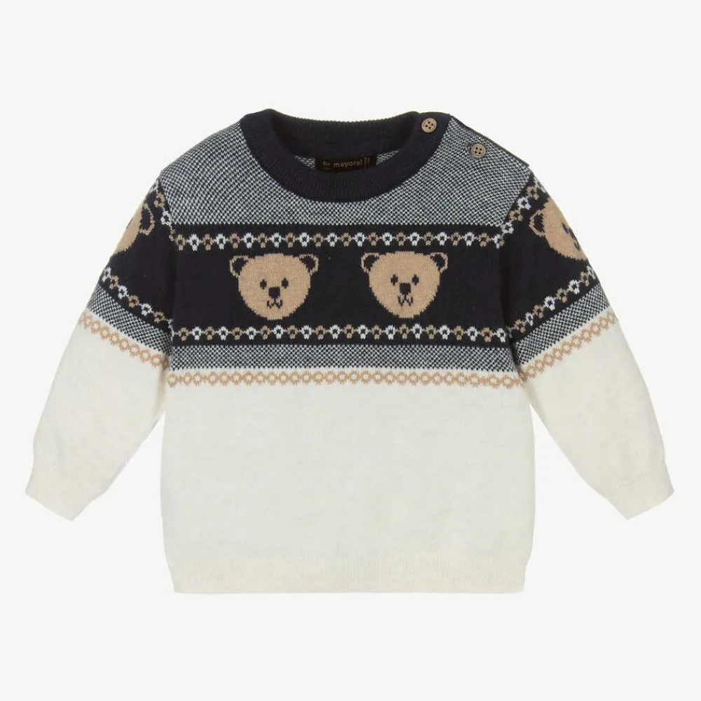In ivory, beige and navy blue, this lightweight sweater for little boys is by Mayoral. It is knitted in a soft cotton and wool blend, with an adorable teddy bear pattern. There are button fastenings on one shoulder to help with dressing. This product contains recycled fibres.