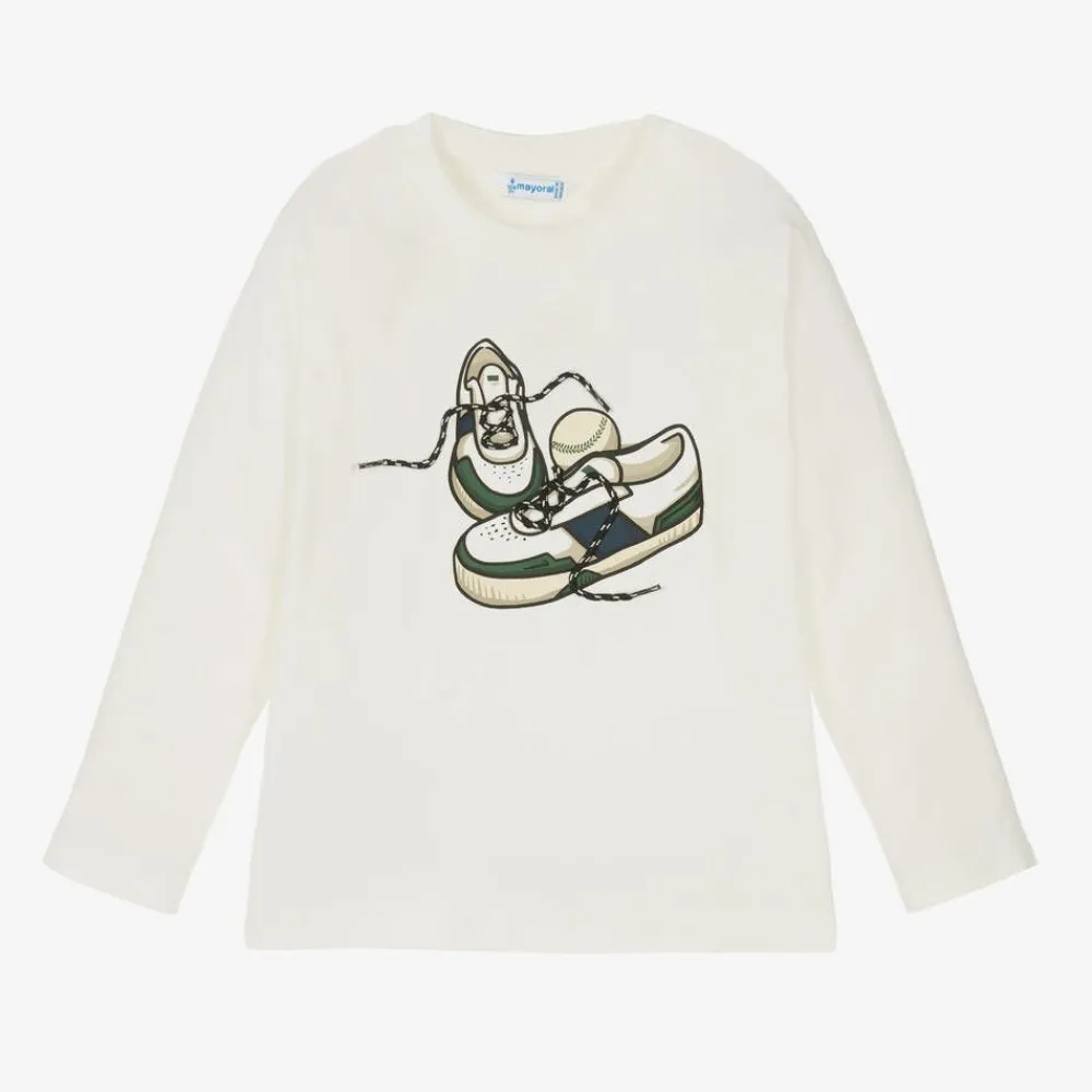 Ivory top for boys by Mayoral, made in soft cotton jersey for comfortable wear. Simply styled, it has a round neckline and long sleeves. A pair of green and blue sports trainers are printed on the front, finished with decorative cord laces. This item is made with 20% recycled fabric.