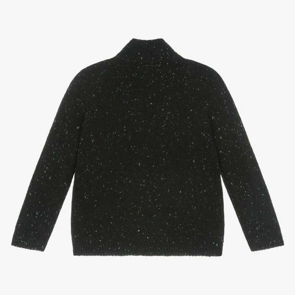 A dark navy blue zip-up top for boys by Spanish brand Mayoral, ideal to wear as an extra layer on cooler days. Knitted with little speckles for contrast, it has added wool in the yarn for extra cosiness and a little rubber patch by the hem.