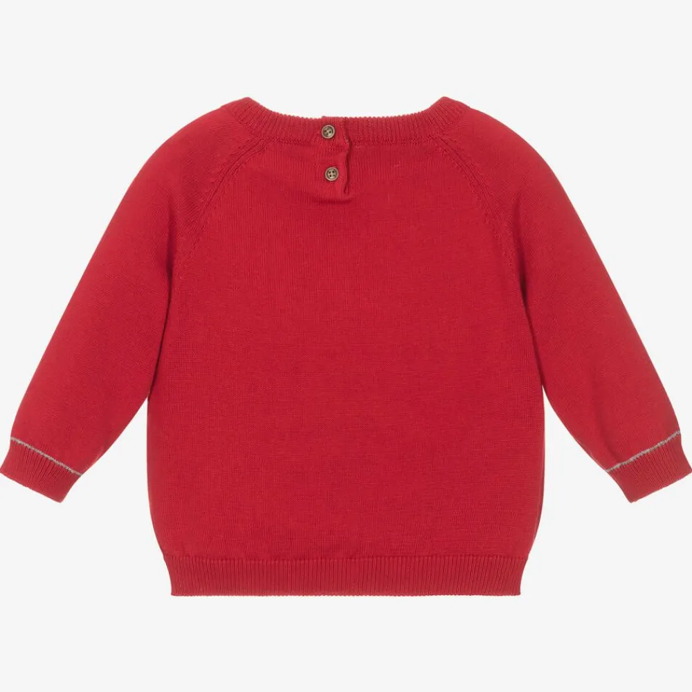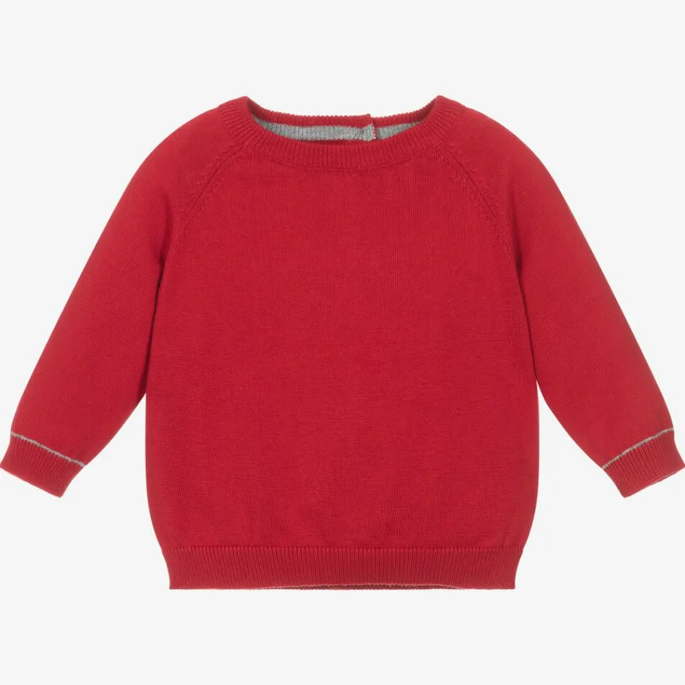 A timeless classic, this simple red cotton sweater for little boys is by Mayoral. Made from a soft knit with ribbed trims, it has a fine grey stripe around the cuffs and button fastenings on the back for a neat finish.