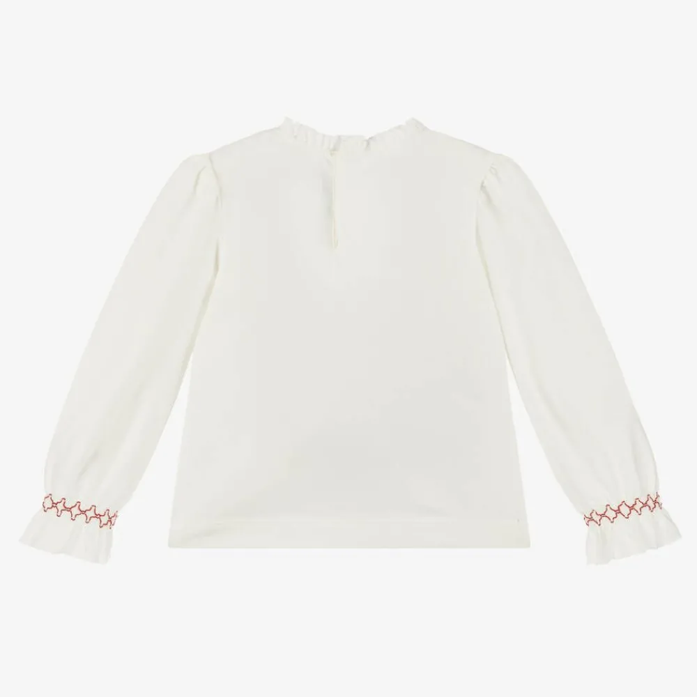 Pretty ivory top for little girls by Mayoral, made from soft cotton jersey. There is a charming ballerina design printed on the chest with red floral tulle trim and sparkly gold dot details. Fastening with poppers on the back, it has puffed long sleeves, a high frilled neckline, shirred fluted cuffs, and a logo-engraved charm on the hemline.