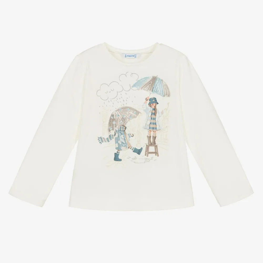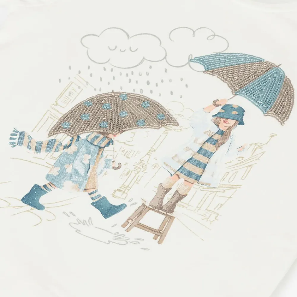 Cute ivory cotton long-sleeved top for girls by Spanish brand Mayoral, made in comfortable jersey. It has a girls-in-the-rain print on the front in blue and beige, shimmering with sequins and shiny gold.