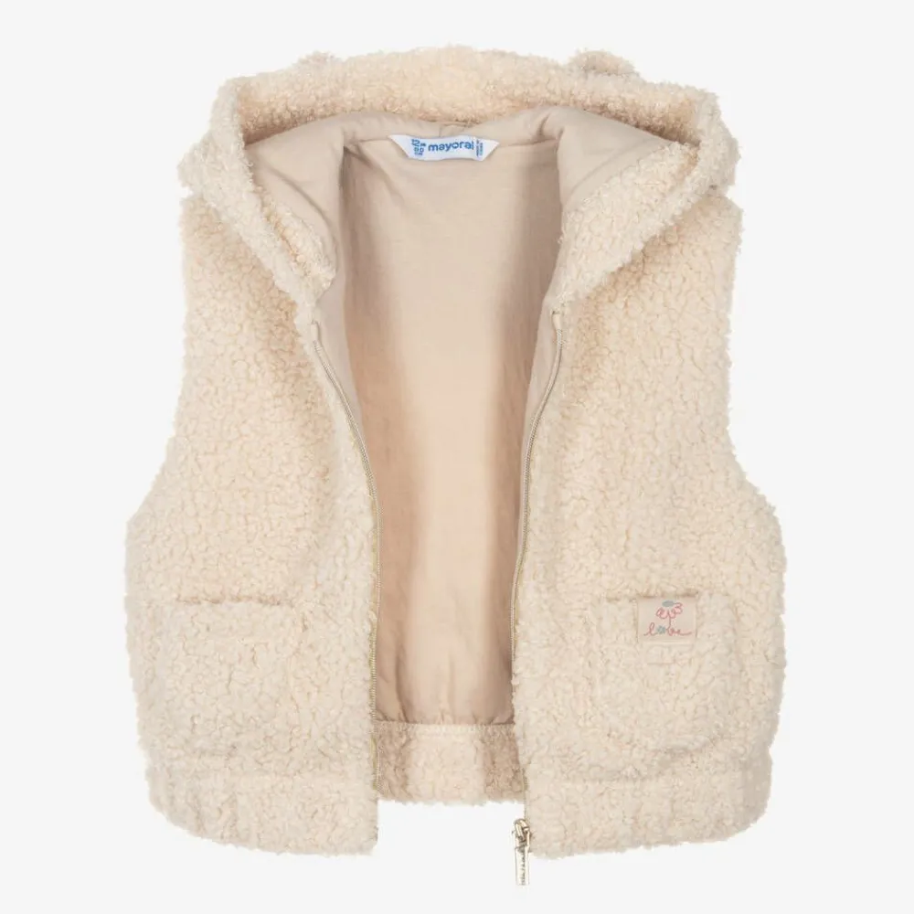 A pink tracksuit set for little girls by Mayoral, made in a comfortable cotton blend. Fleecy on the inside, the jersey sweatshirt has casual raglan sleeves with a delicately textured floral design. Popper fastenings on the back make dressing easier. The matching joggers have ribbed cuffs and a stretchy waistband for comfortable wear. Adding an extra layer of warmth, the borg gilet has a cosy hood with adorable 3D ears on the top. It is elasticated around the hem and comfortably lined with jersey.