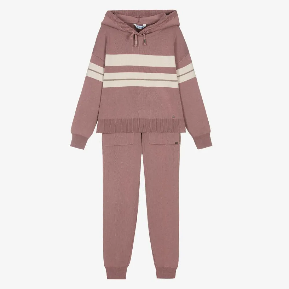 A dusky pink tracksuit for older girls by Mayoral, detailed with logo plaques. Knitted in a soft mix with viscose, both are trimmed with ivory and beige stripes for chic, laid-back styling. The hooded top has faux drawstrings on the front and split details on the hem. The cuffed joggers have an elasticated waist, decorative drawstrings, and front pockets.