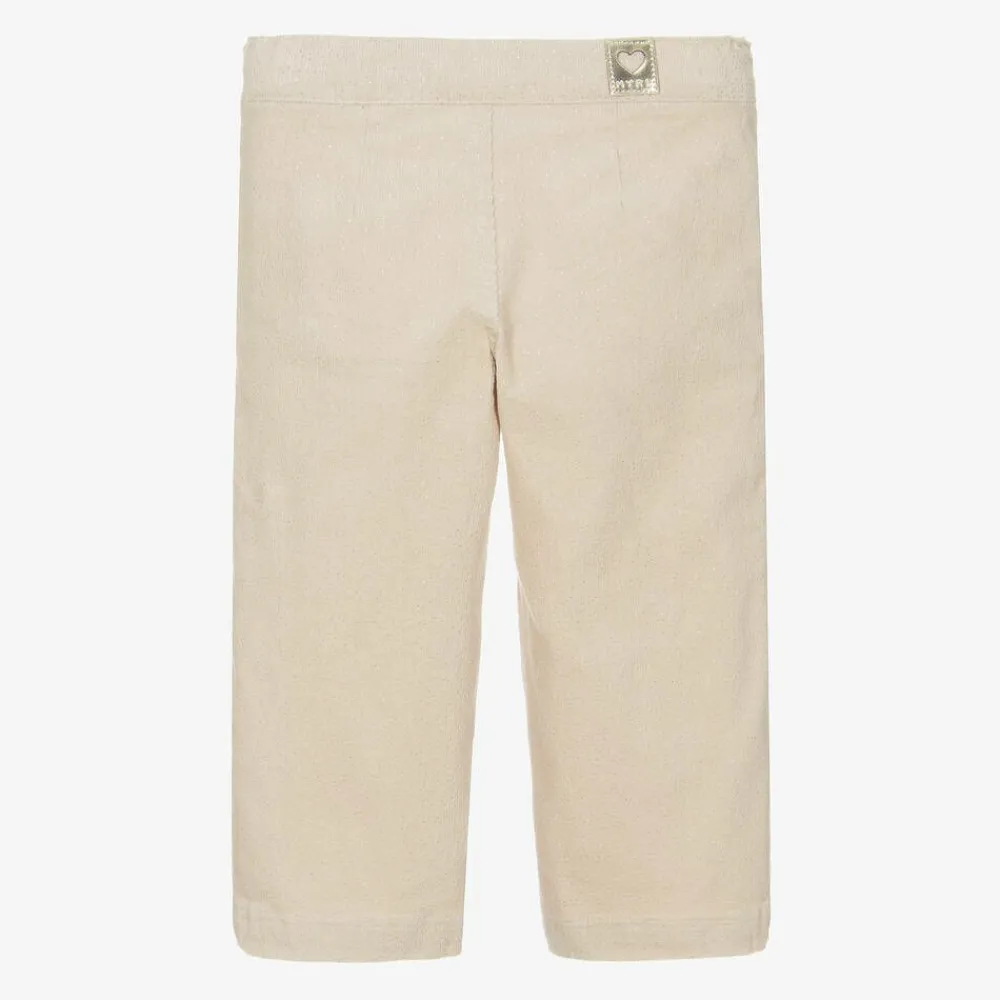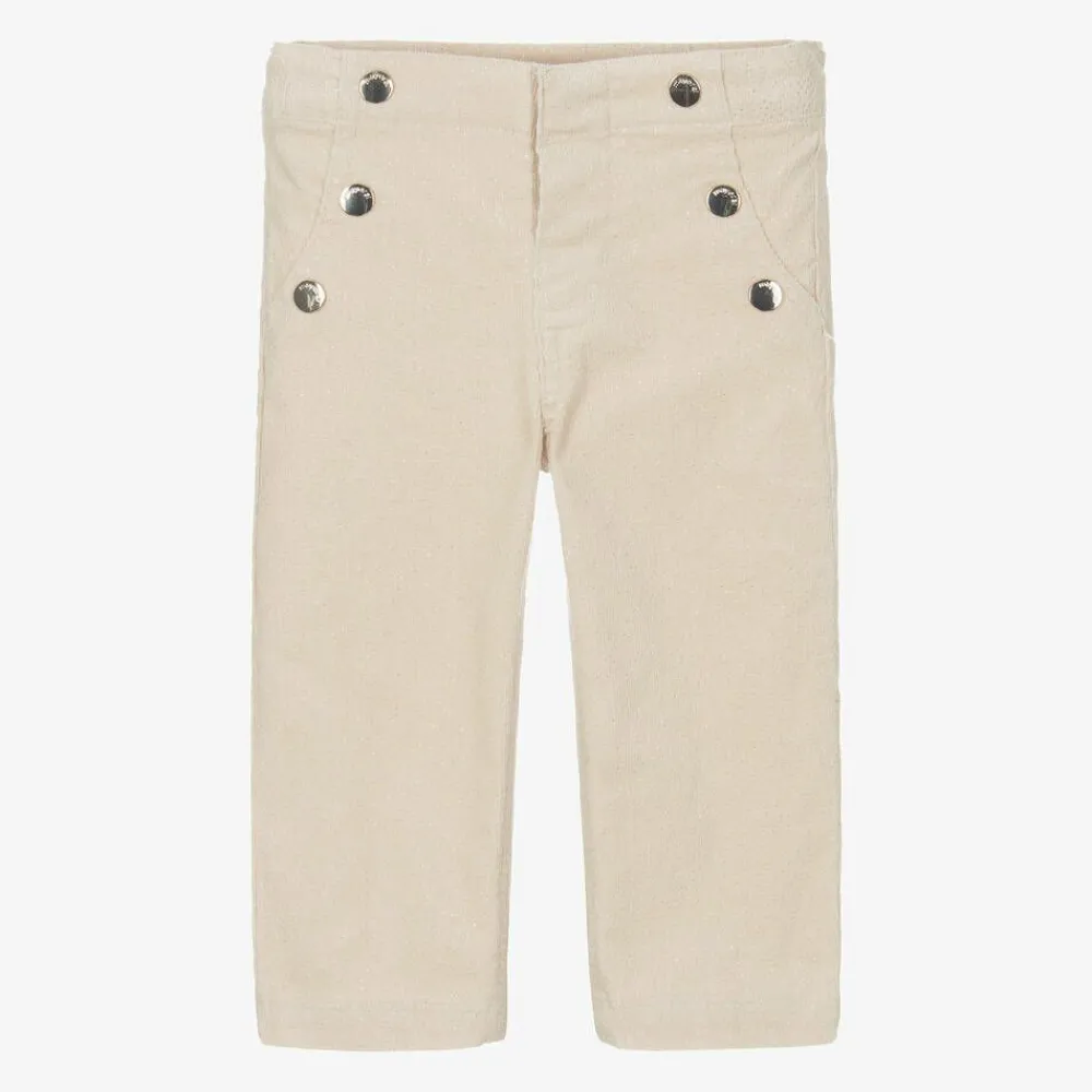 Girls light beige trousers by Mayoral, made in fine cotton needlecord with a glittery silver finish. These gorgeous trousers have a wide leg silhouette with decorative gold buttons on the front. The popper-fastening waistband is fully adjustable for a comfortable fit and feel.