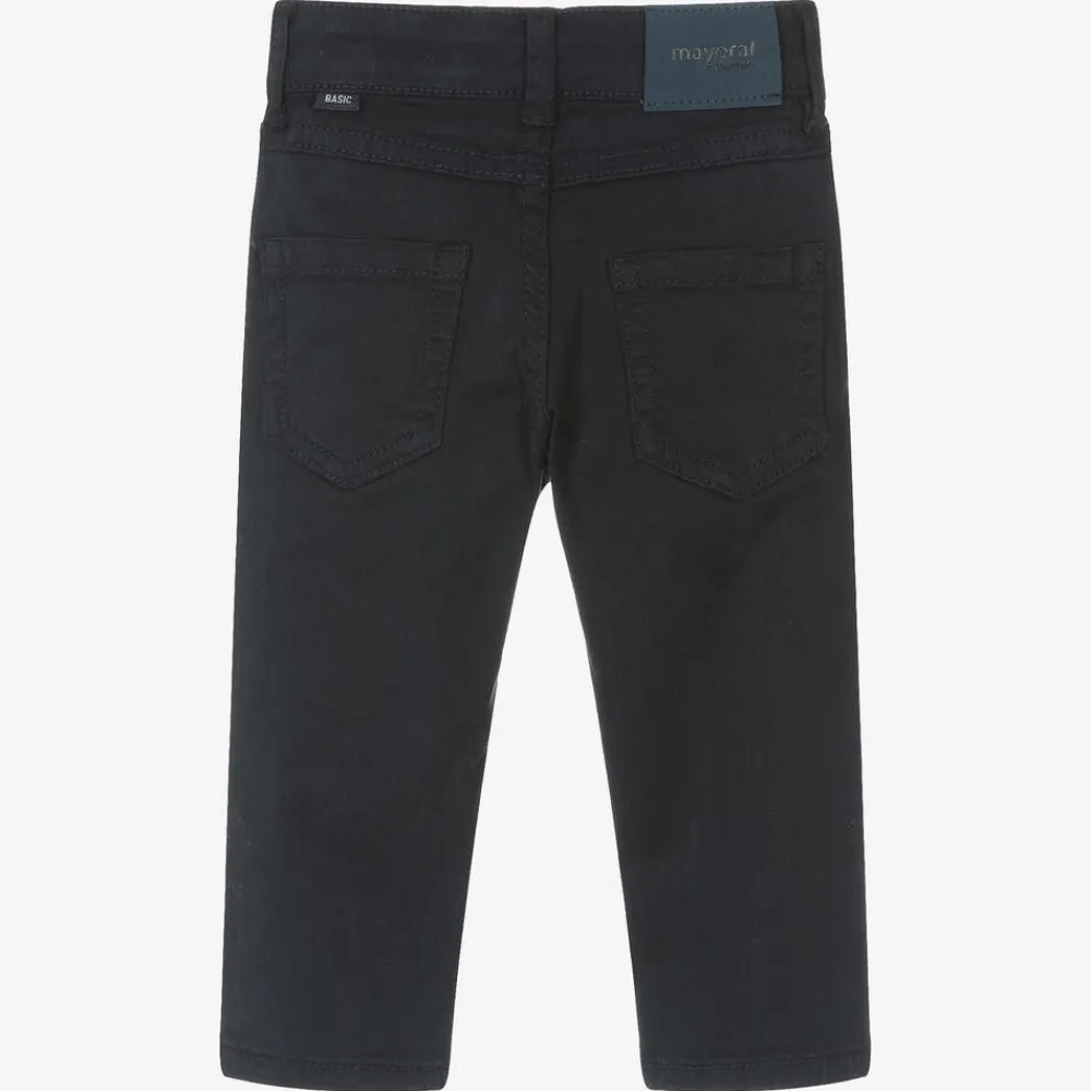 Classic navy blue cotton jeans for little boys by Mayoral, made from soft brushed twill. They have the standard five-pocket detailing, with belt loops and a front popper fastening for easy dressing. There is a branded foam patch on the back, and an adjustable waist for a comfortable fit.