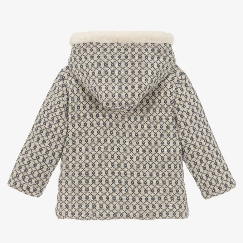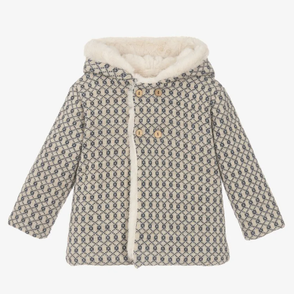 Ideal for colder days, this beige and blue wool-blend coat for boys and girls is designed by Mebi. Lined in luxuriously soft plush faux fur for ultimate warmth, it has a geometric, diamond design and useful hood. To fasten the style simply, there are wooden-style buttons on the front.
