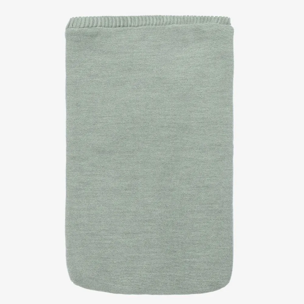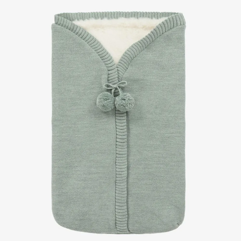 Super snuggly, knitted baby nest for boys and girls by Spanish brand Mebi, in a lovely sage green shade. It is lined in luxuriously soft ivory plush faux fur to keep your little one cosy and has a concealed front zip fastening. There are ribbed trims and decorative pom-poms on the front.