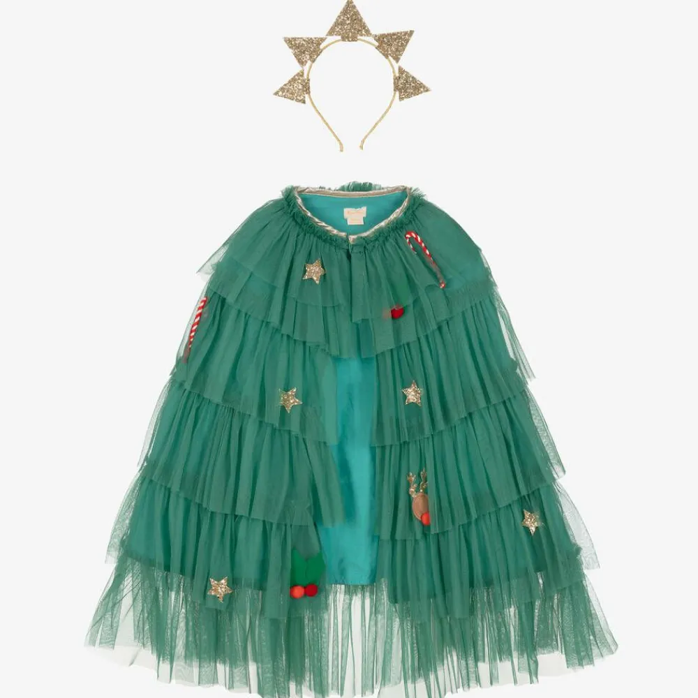 Designed for fun times over the festive season, this cute Christmas tree costume for boys and girls is by Meri Meri. The green cape is made from layers of soft tulle with festive holly, reindeer, candy canes and glittery gold star appliqués. It is lined in soft cotton for comfort and has a popper fastening at the neck. The costume is completed by a glittery gold hairband, which is designed to look like the star on the top of the tree when worn.