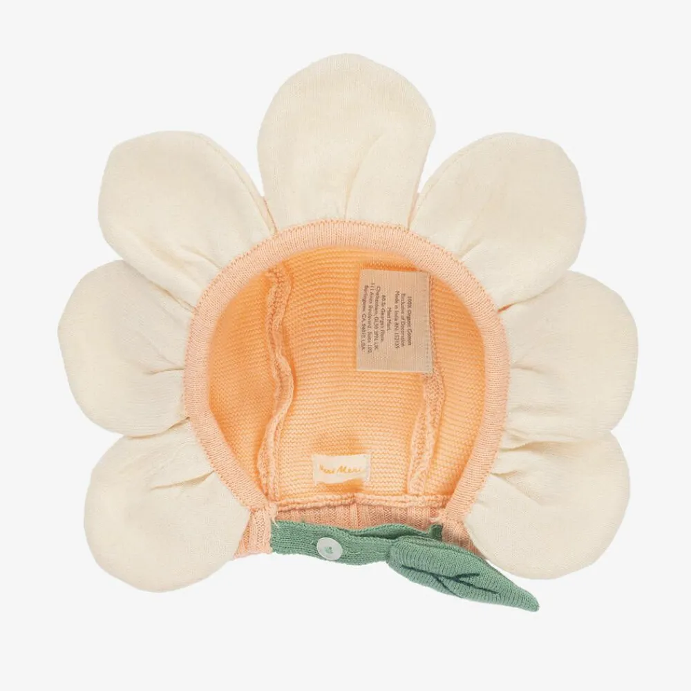 Adorable pink organic cotton bonnet for girls by Meri Meri. Beautifully knitted, it has sweet ivory 3D petals with a contrasting green leaf strap which secures with a button fastening under the chin.