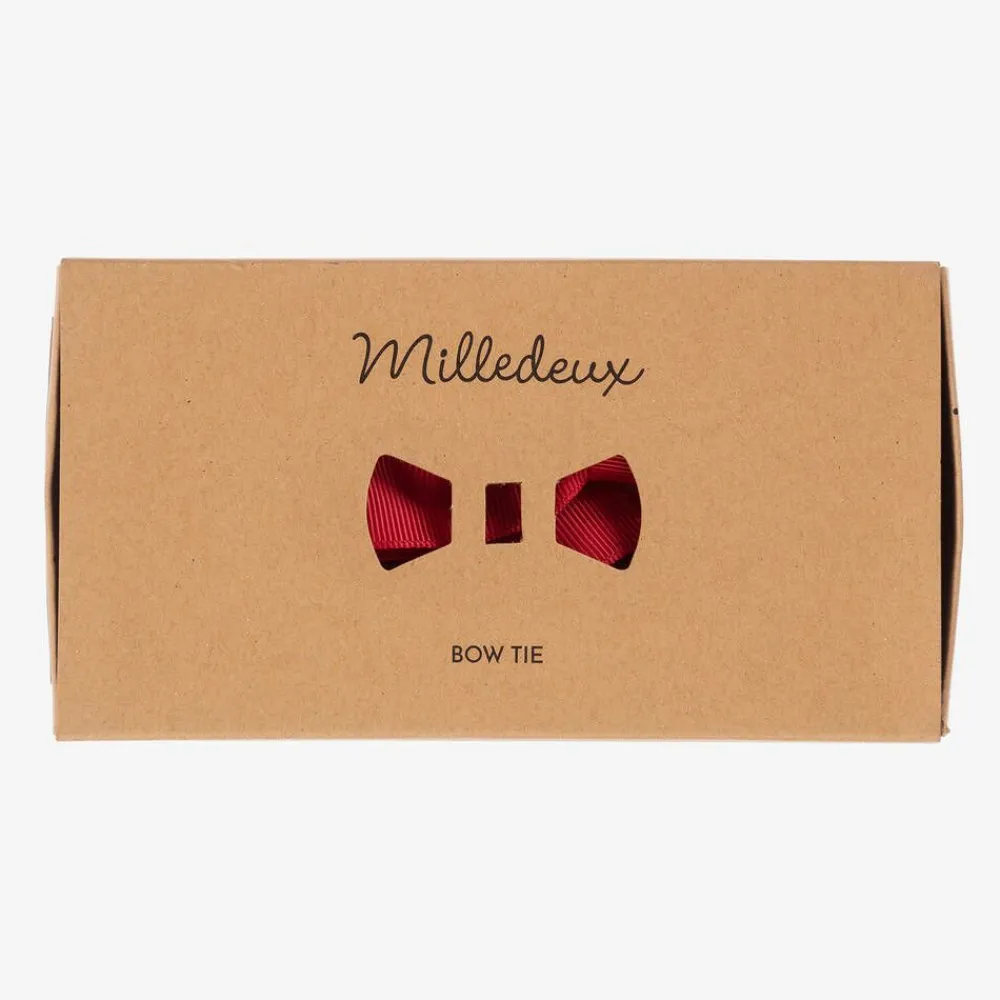 Smart red bow tie for boys by Milledeux. It is made in grosgrain ribbon and has an adjustable neck strap.