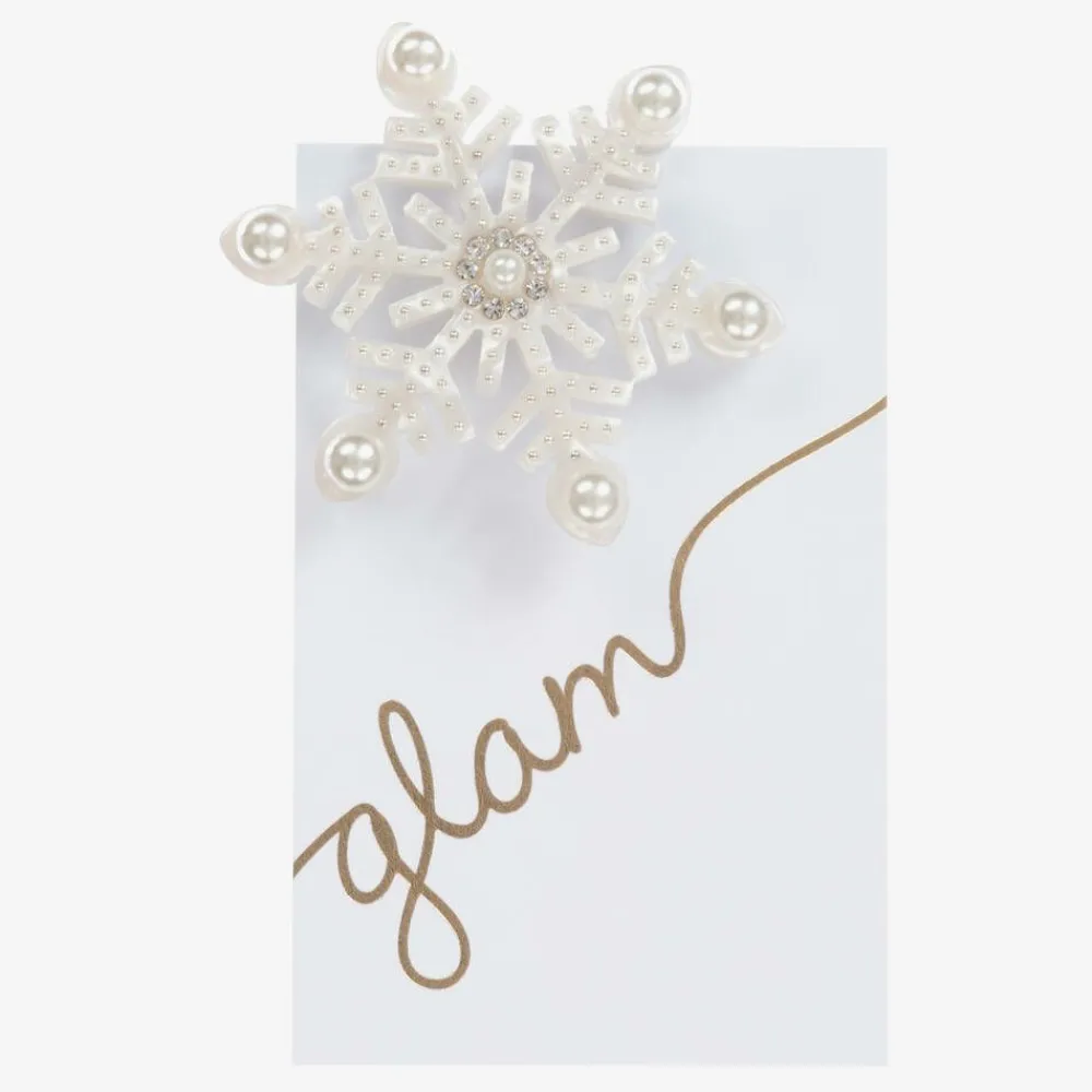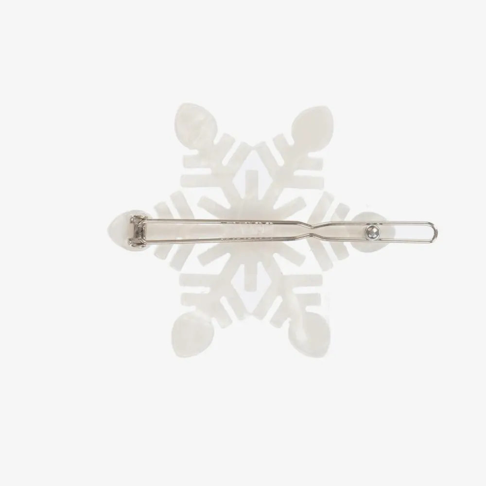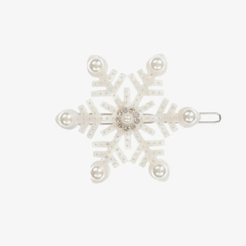 A pretty snowflake hair clip for girls by Milledeux. The pearly white snowflake is trimmed with pearls and diamanté, and sits on a nickel free metal clip.