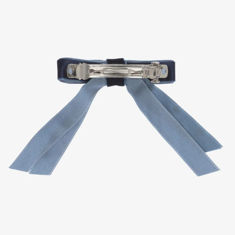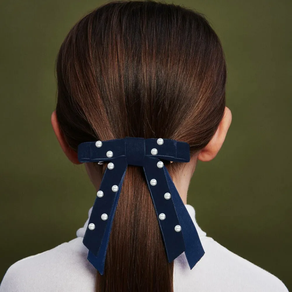 A pretty velvet ribbon hair clip for girls by Milledeux. The navy blue bow is trimmed with pearl beads and sits on a nickel free metal clip.