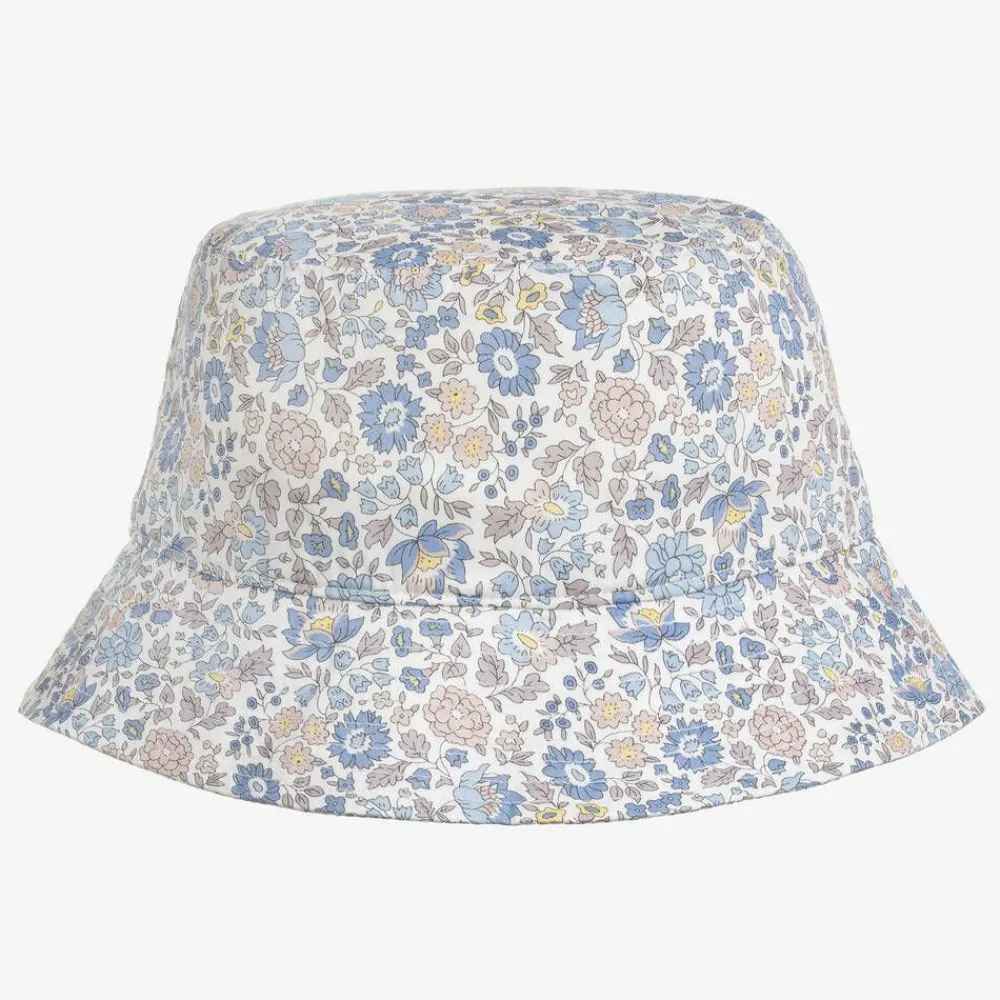 White bucket style sun hat for girls by Milledeux, made in soft, lightweight cotton. Patterned with a pretty blue and beige floral Liberty print, it is fully lined for comfort. Ideal for warm sunny days, it has a wide brim to shade the eyes from the sun.