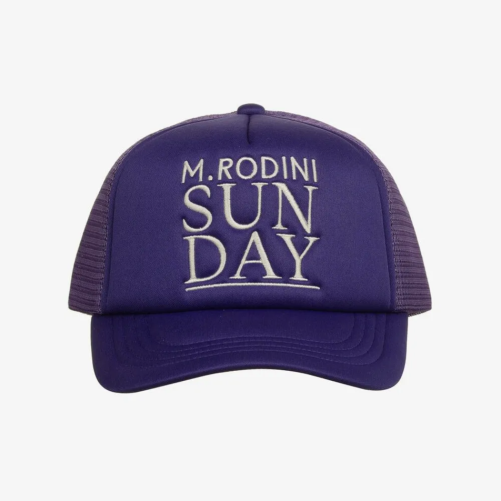 From Mini Rodini, a purple baseball cap for boys and girls. Sporting a cool 'Sunday' look, it has bold white embroidered lettering and logo. It is made in a cool combination of soft neoprene and mesh from recycled sources. The back fastens with adjustable straps.