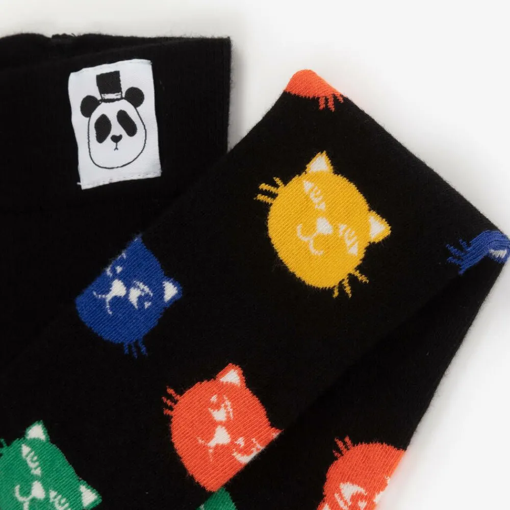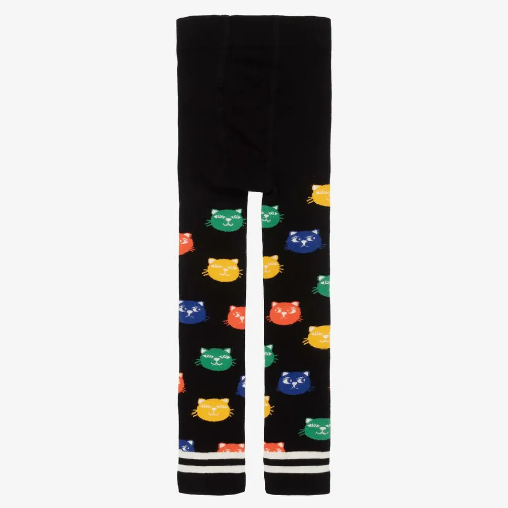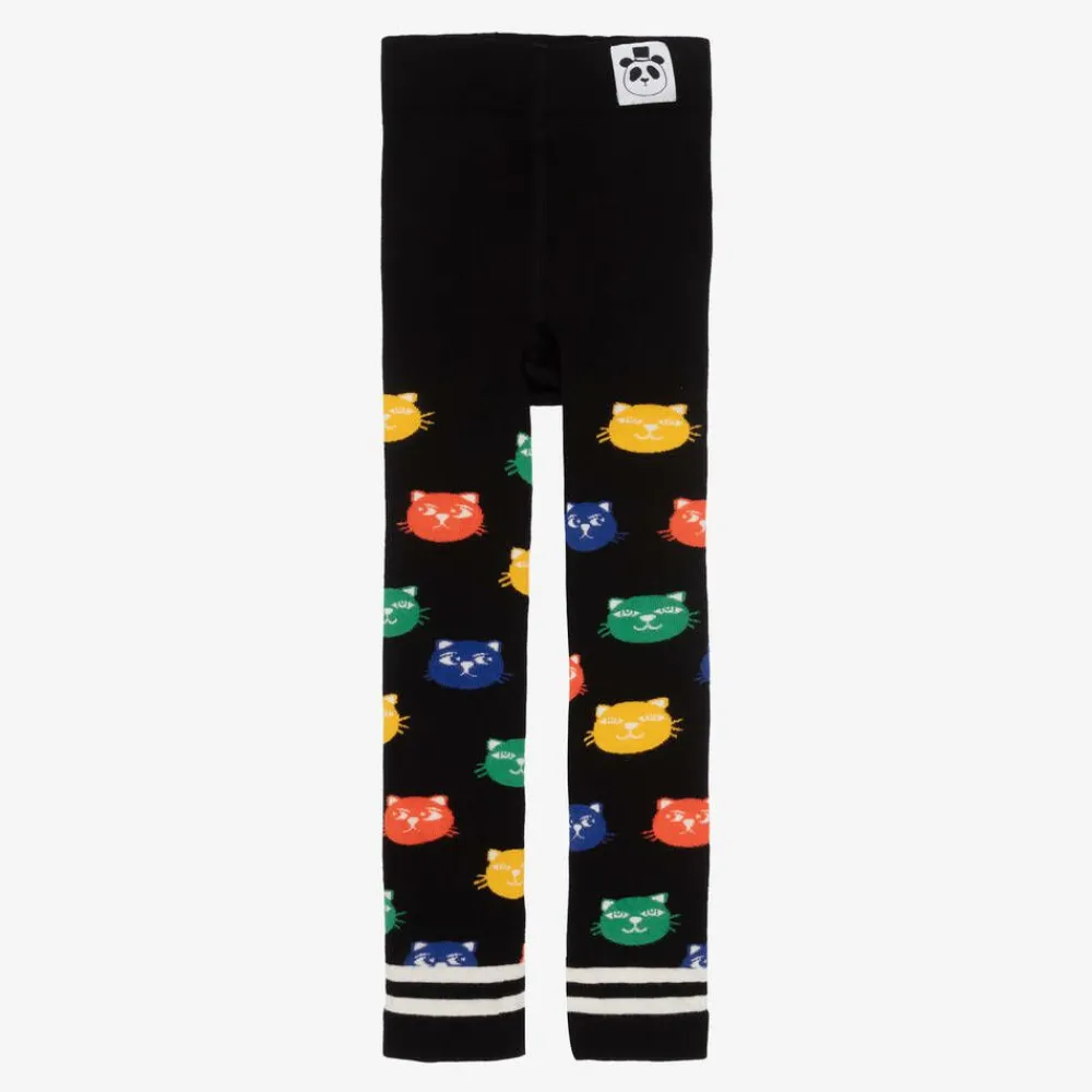 A pair of black leggings for girls from Mini Rodini, with a cute and colourful cat pattern. Soft and stretchy, they are made in an organic cotton blend, with white stripes a te ankles and the brand's panda patch below the gently elasticated waist.