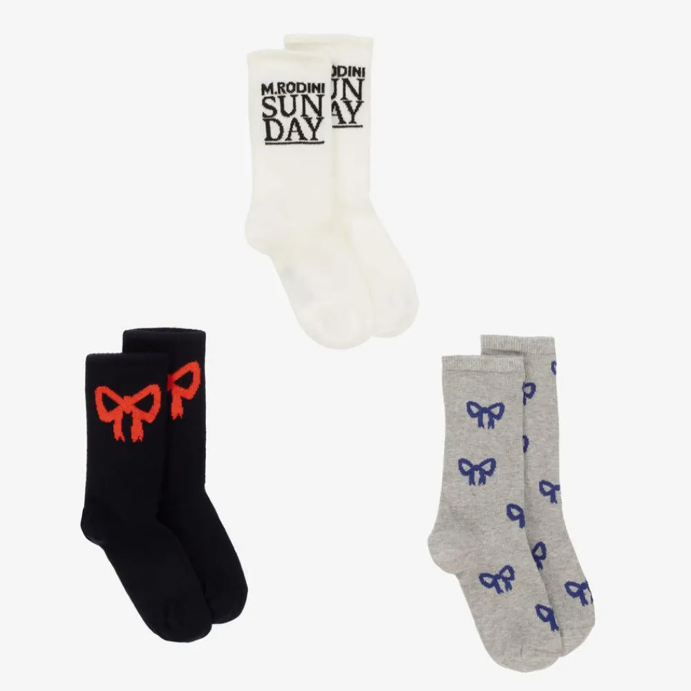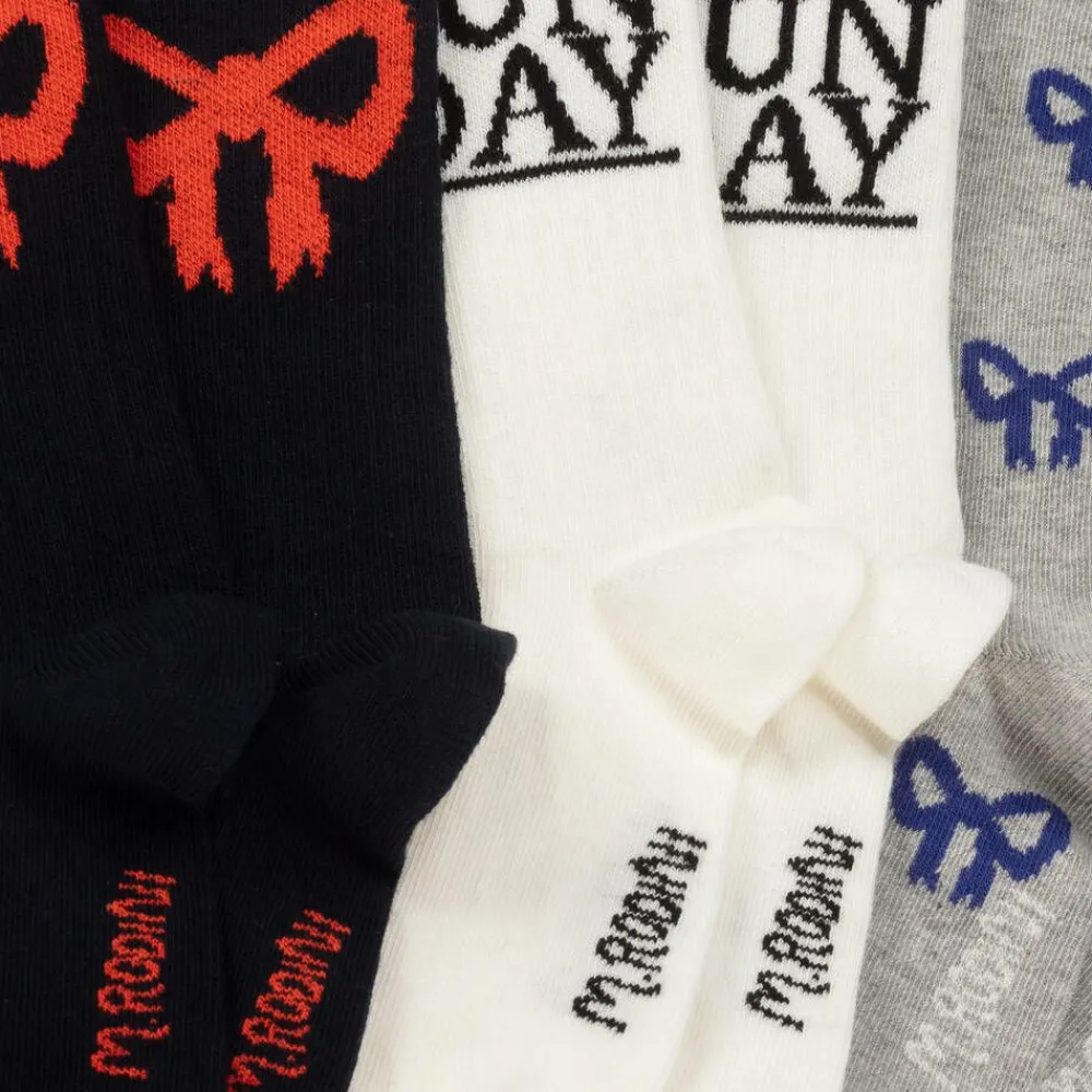 Three pairs of organic cotton rich socks for girls by Mini Rodini. The navy blue pair has a red bow motif, the grey pair is in a purple bow pattern, whilst the off-white and black pair has the brand's 'Sunday' theme.