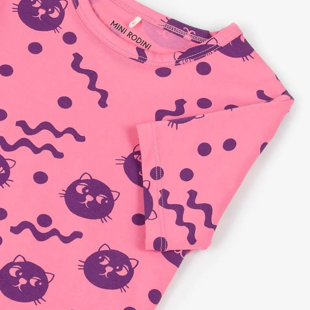 Fun and vibrant pink T-shirt for girls by Mini Rodini, patterned with cute cats and squiggly motifs in purple. This comfortable short sleeve tee is made in super soft organic cotton jersey.