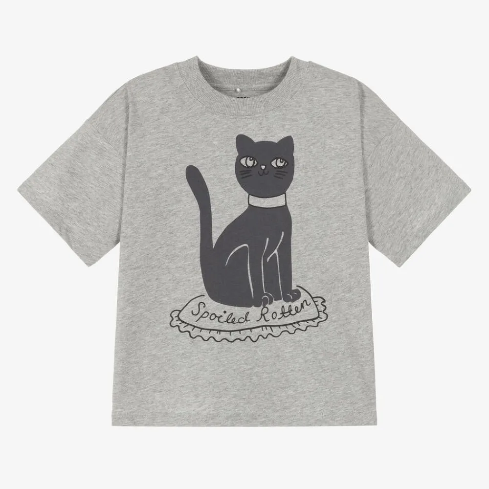Grey marl T-shirt for boys and girls by Mini Rodini, made in soft organic cotton jersey. It has a ribbed crew neck and short sleeves with dropped shoulder seams for a more relaxed fit. A pampered cat is printed on the front in dark grey, with a 'Spoiled Rotten' slogan below.