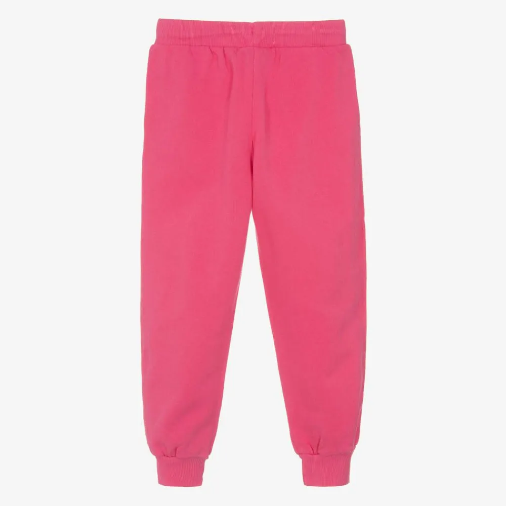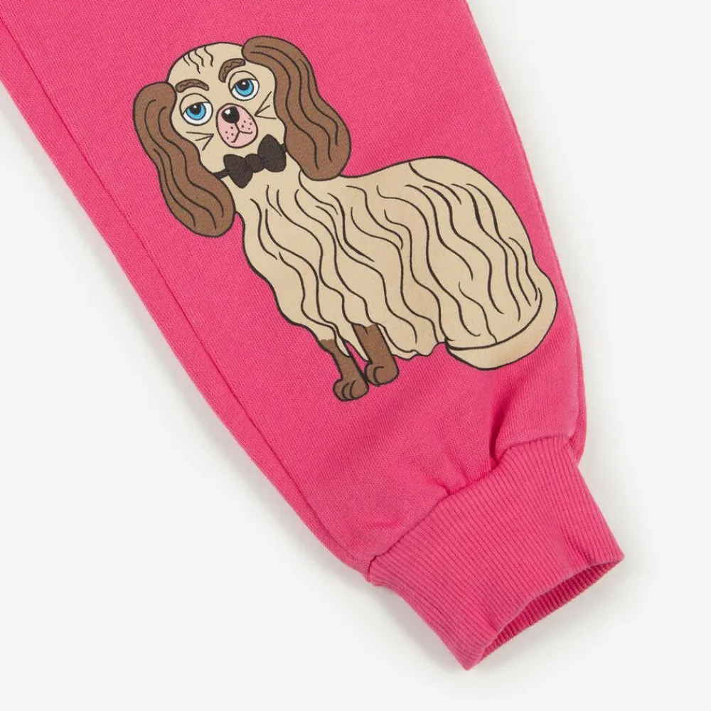 Cosy, fuchsia pink joggers for girls from Mini Rodini, made in soft, mid-weight organic cotton jersey. These casual trousers have a fun beige and brown dog wearing a bowtie printed on one leg. There are side pockets and a gently elasticated waist with a drawstring tie for a comfortable fit.