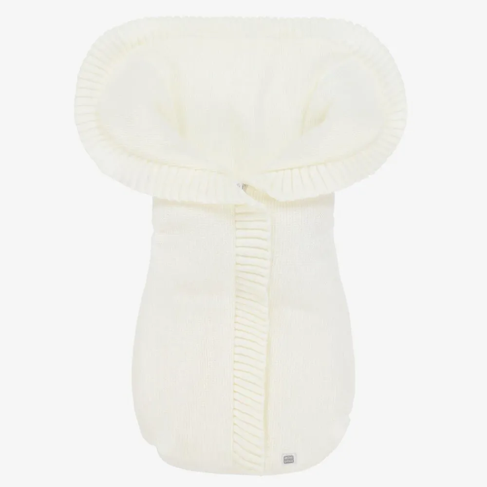 A lovely ivory knitted baby nest for boys and girls by Minutus. Beautifully soft and warmly padded, it has a knitted lining and knitted ruffle trims. There is a concealed front zip fastening, with a small branded tab at the bottom.