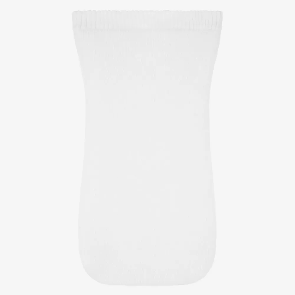 Baby girls and boys white baby nest by Minutus, warmly padded and knitted in soft acrylic. It has a zip fastening on the front and is ideal for use in the pram or car.