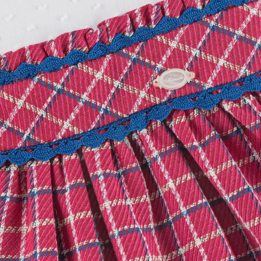 A charming white and pink dress for girls by traditional Spanish brand, Miranda. Made in soft and lightweight cotton plumeti with lovely ruffle trims, this long-sleeved style has a pink and blue checked overlay on the skirt with embroidered blue trims and a logo charm on the front. There are contrasting blue buttons to fasten on the back, together with a pretty bow detail that secures with a button.
