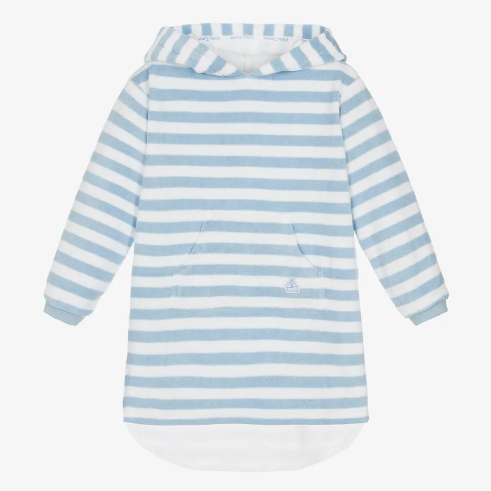 Exclusive to Childrensalon, a pale blue and white striped cotton robe for girls and boys by Mitty James, ideal for the beach or pool. Hooded and soft, it is made in absorbent towelling with a logo patch on the useful pouch pocket. Easy to wear, it is loose-fitting and just right as a comfortable, practical cover-up.