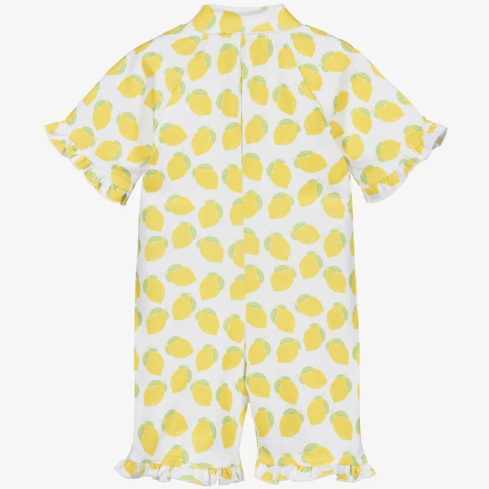 Exclusive to Childrensalon, a white sun suit for girls by Mitty James, with a cute yellow lemon print. It is made in super comfortable, silky fabric with UPF 50+. It has feminine, frilled trims and the brand's logo embroidered in green on one leg. The front zip fastening has a useful, protective chin guard.