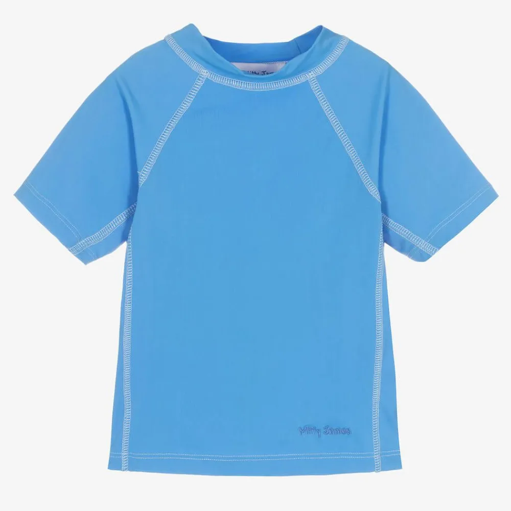 Exclusive to Childrensalon, a mid-blue swim T-shirt for boys and girls by Mitty James, ideal for the beach or poolside. Made in silky, stretchy jersey with UPF 50+, it has a stand-up collar, white over-stitch detailing and an embroidered logo in contrasting blue by the hemline.