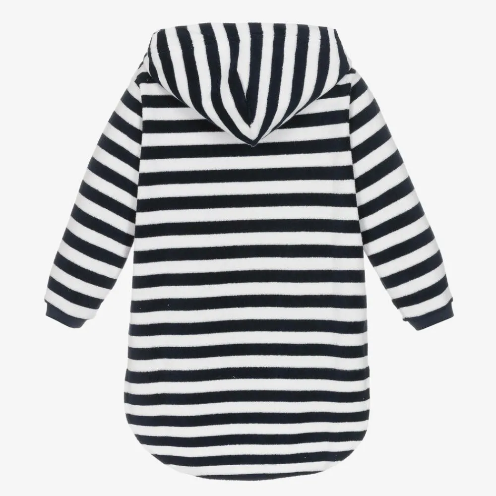 Exclusive to Childrensalon, a navy blue and white striped cotton robe for girls and boys by Mitty James, ideal for the beach or pool. Hooded and soft, it is made in absorbent towelling with a logo patch on the useful pouch pocket. Easy to wear, it is loose-fitting and just right as a comfortable, practical cover-up.